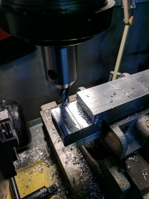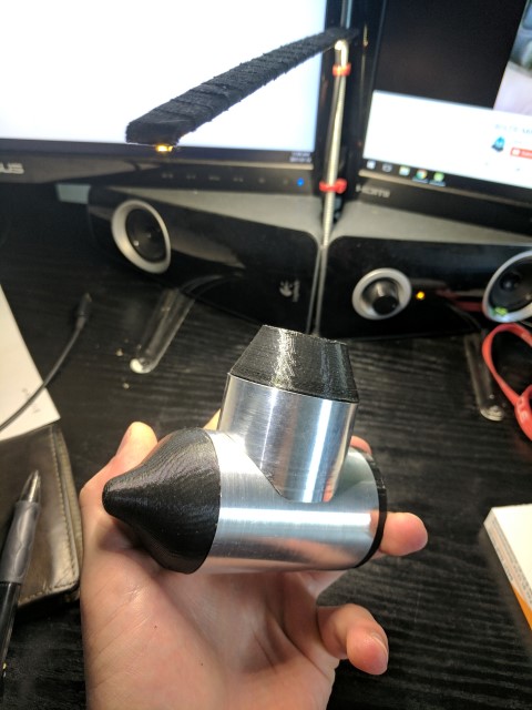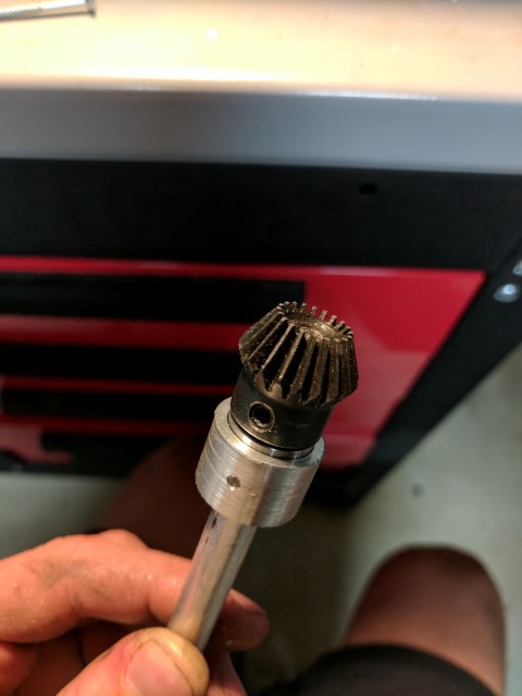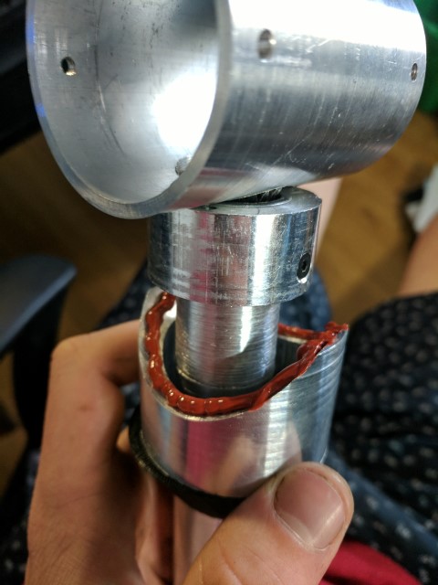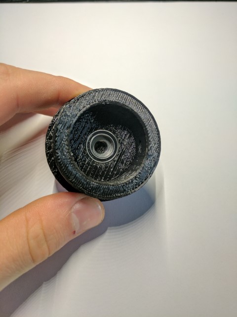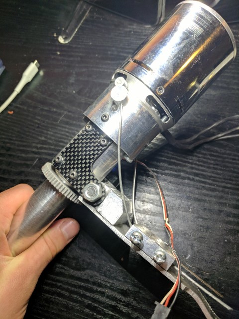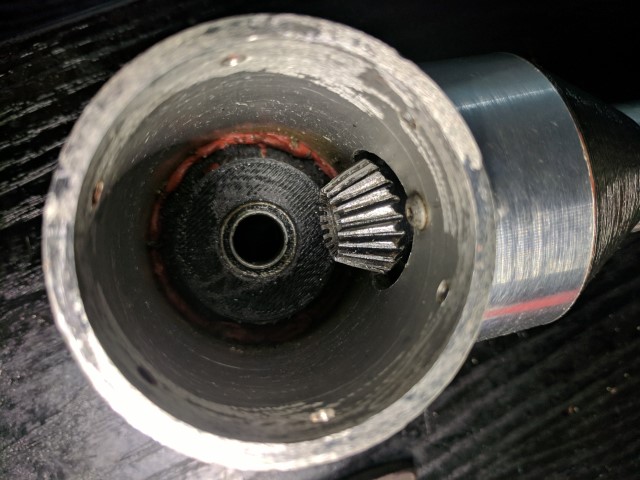 The new outboard more closely resembles a traditional outboard engine with the motor above water level, connected to the propeller through a vertical driveshaft and a 90* bevel gear set. This allows me to have a 2:1 gear reduction through the bevel gears and also keep the motor out of the water. Unfortunately I lose water cooling, but it gives me the piece of mind of a dry motor that won’t get banged up by rocks or other stuff in the water. Most of the components are built out of 6061 aluminum. I’m lucky to have access to a manual mill and lathe; without it this project would have been pretty much impossible. The parts in black are 3D printed from PLA. Apparently PLA can break down in water due to its biodegradable nature, but I haven’t had any issues. The lower drivetrain is sealed from water and features a stuffing box filled with axle grease at the prop shaft output. This has kept most of the water out, but I believe I need to reseal some of the screw holes to make it 100% watertight. Radial bearings are used throughout the driveline and there is a thrust bearing inside the back endcap which transmits the thrust force of the prop shaft to the rest of the outboard.