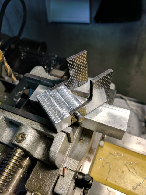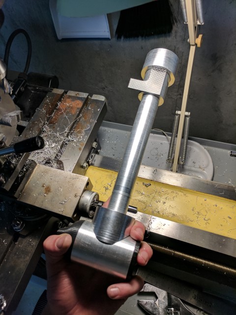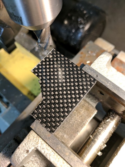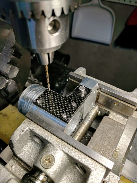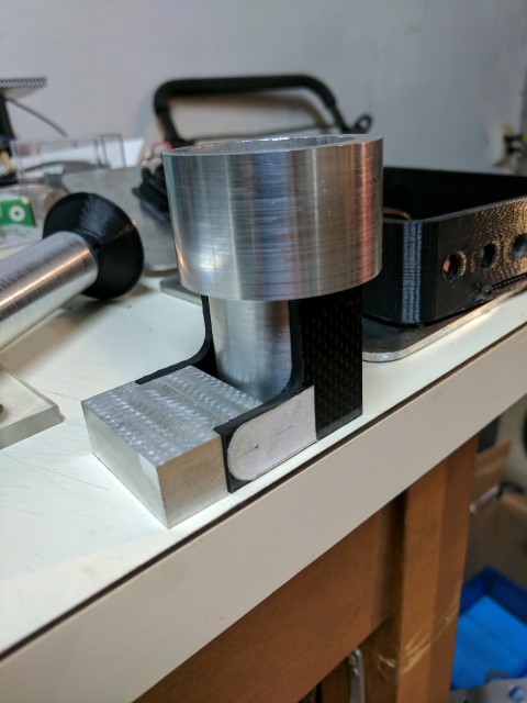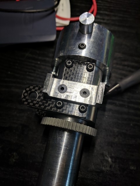 I liked the ability to flip the entire outboard assembly up in the previous e-kayak build, so I carried it over to this one. However, gone is the janky cabinet door hinge, replaced by a solid block of 6061 that holds a steel pivot pin, threaded on both ends. Carbon fiber plates are used to hold the outboard assembly to the mount. This setup has reduced play to being basically non-existent. It will be interesting to see how it copes when the boat is turning and the direction of thrust force is not perpendicular to the pivot pin, because this will cause some nasty twisting moments in the assembly.