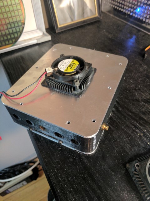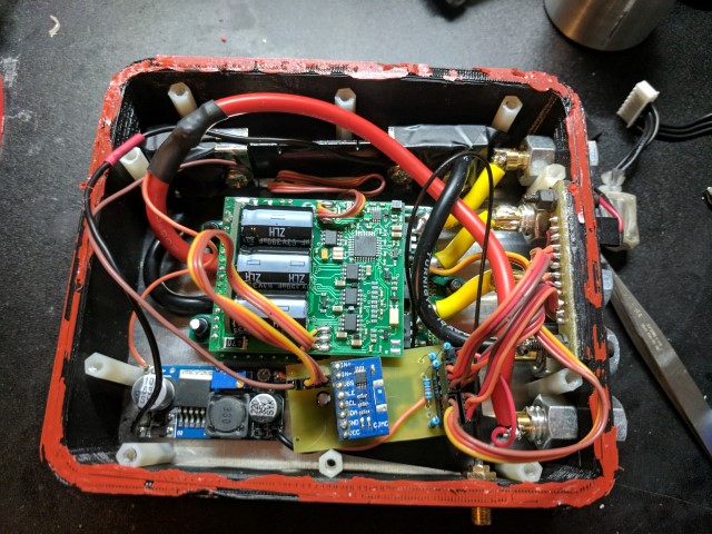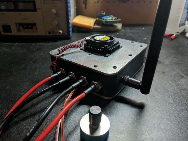 Apart from being able to drive the motor, the electronics in this black box are also responsible for controlling the steering, taking in power and temperature telemetry, and creating a wifi hotspot for two way communication with my phone. I’ll begin with the simplest component- the electronic speed controller. It’s the large green piece with fat wires going into it. As explained earlier, it’s essentially a variable frequency inverter that uses large FETs and switching circuits to turn the DC voltage from the batteries into 3-phase AC for the motor. It has it’s own microprocessor on board and takes commands in the form of a PPM signal, which is the standard in the R/C industry for controlling ESCs and servos. The ESC is mounted to the aluminum top plate and the FETs make direct contact to the surface through a thermally conductive pad. A CPU cooler mounted on the other side of the plate further helps dissipate heat. This solution has worked well enough that even during long runs, ESC temp never goes higher than 10-15 deg above ambient.