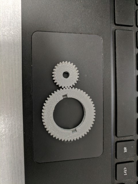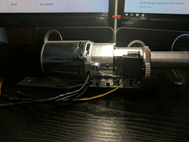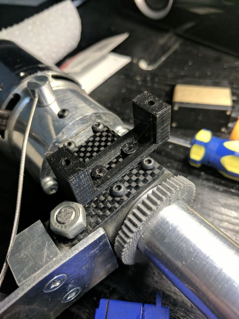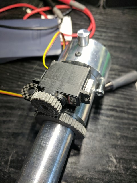 Steering duties are taken care of by a micro servo and a 3D printed gear set. Eventually it might be nice to have a 360* servo, but this introduces problems with determining the exact angle of the outboard because you lose position feedback. For now +/- 45* of throw is sufficient.